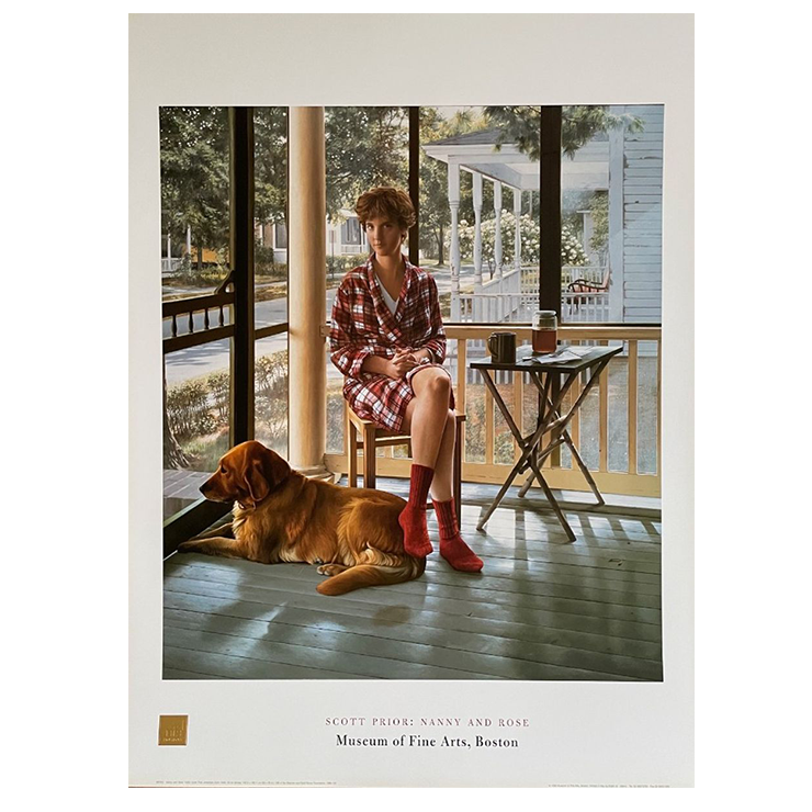 Scott Prior – "Nanny and Rose", 1983. Deze prachtige prent, in 1998 auteursrechtelijk beschermd door het Museum of Fine Arts in Boston, legt een ontroerend moment van huiselijke intimiteit vast tussen de vrouw van de kunstenaar, Nanny, en hun hond, Rose. Gemaakt halverwege de jaren 80, toen Prior zich vooral op familie en thuis richtte, weerspiegelt dit werk zijn overtuiging dat de geschilderde intimiteit van het gewone leven vastgelegd en gevierd moet worden. De prent verkeert in goede staat, is nooit ingelijst geweest en is zorgvuldig bewaard in mijn archief. Uw bestelling wordt veilig verpakt en verzonden in een kartonnen koker om een veilige levering te garanderen. Een prachtig stuk voor verzamelaars van hedendaags Amerikaans realisme en voor degenen die de warmte van alledaagse momenten waarderen.