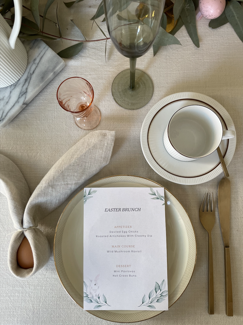 Naast naamkaartjes is het ook heel leuk om een gezellig Paasmenu samen te stellen. De menukaarten kun je qua kleur afstemmen op jouw eigen Paastafel. Je kunt de kaarten ook in echte paasvormen knippen zoals een ei of een haas.