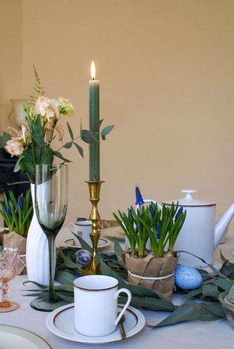 Bloembollen zoals narcissen en blauwe druifjes zorgen voor een heerlijk lentegevoel in huis! Het fijne aan kleine bloembollen is ook dat de bloemen niet zo lang zijn en je elkaar dus nog gezellig over tafel aan kunt kijken wanneer deze op tafel staan. Een vaas met een groot boeket is natuurlijk prachtig, maar niet zo praktisch wanneer je aan tafel gaat. Je kunt de bloembollen in plantenpotjes zetten, maar kleine kommetjes of een stukje inpakpapier dat je over hebt kunnen ook prima dienst doen. Op de foto zijn de potjes ingepakt met een stukje oud papier dat om een bos bloemen zat. Wanneer Pasen voorbij is, kun je de bloembollen in jouw tuin planten, zo heb je er tweemaal plezier van!