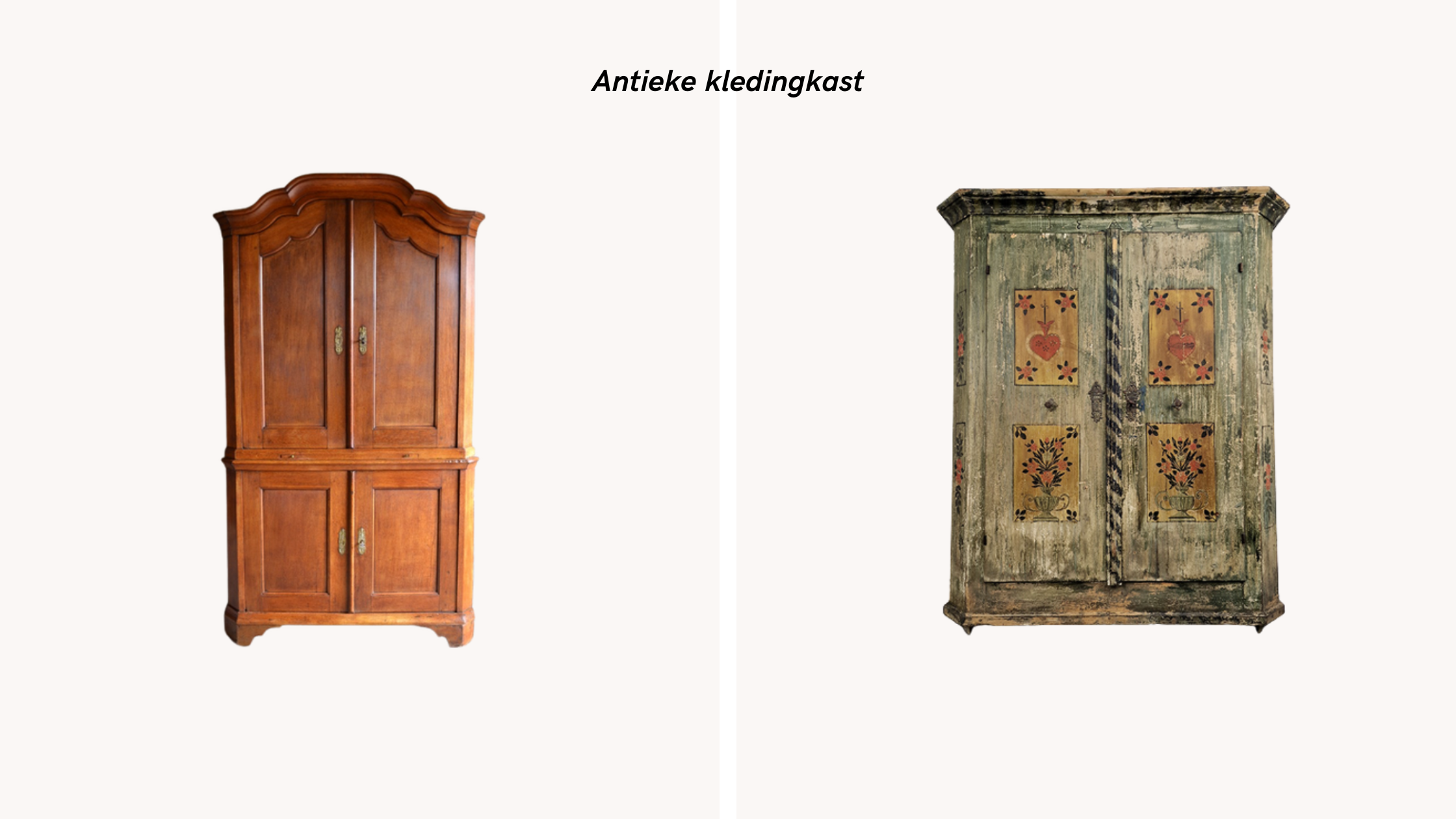 Een kledingkast die tijdloos en klassiek is, is de antieke kledingkast. De kledingkast is voornamelijk gemaakt van hout en heeft een echte antieke uitstraling. Zo zijn de meeste antiek houten kasten ingespeeld op detail en hebben dus die echte klassieke uitstraling. De kleuren van een antieke kledingkast kunnen varieren, maar meestal hebben de kasten een donkere kleur. Een houten kast slaapkamer in de antieke stijl trekt de aandacht en maakt de slaapkamer persoonlijker. Wanneer je de aandacht nog meer wil trekken kan je ervoor kiezen om een oude houten boekenkast om te toveren tot kledingkast. Dit weerspiegelt speelsheid en laat een echte vintage vibe achter.