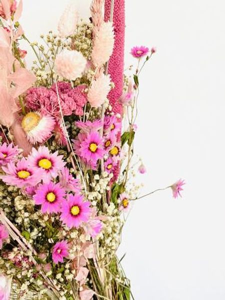 Zorg voor een combinatie van vullers zoals gipskruid, met grote, sierlijke bloemen (denk aan: rozen) en tot slot extra textuur van bijvoorbeeld konijnenstaartjes of phalaris. Ik vind rhodante, ixodia, lagurus en helichrysum de mooiste gedroogde bloemen, maar mijn huidige favoriet is de craspedia, het bekende gele bolletje.