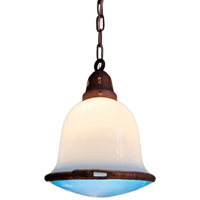 Bauhaus-hanglamp uit de jaren 20, bestaande uit een witte en blauwe opaline globe in het bovenste gedeelte en een blauw satijnglas in het onderste gedeelte, allemaal omgeven door een koperen frame. Zeer zeldzaam model geproduceerd in Duitsland, fabrikant niet geïdentificeerd, maar de annotatie „rlin” voor „Berlin” staat op het blauwe glas vermeld. De ophanging is opnieuw geëlektrificeerd en is compatibel met een e27 ledlamp. Afmetingen: 19 x 19 x 80 cm